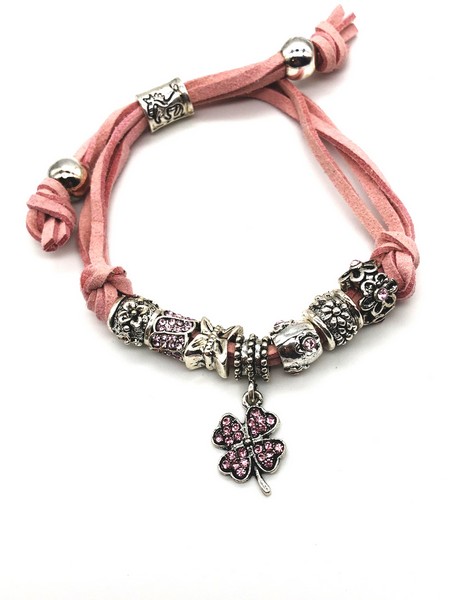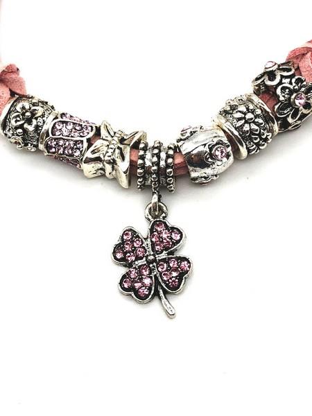 Négylevelű lóhere medállal és kristályokkal díszített fonál karkötő (rózsaszín)