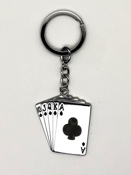 Nemesacél kulcstartó a póker legszerencsésebb lap-kombinációjával (Royal Flush)
