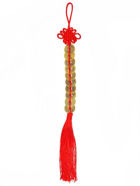 10 db. 20 mm-es kínai pénzérméből készült füzér, függeszthető felső végén misztikus csomó, alsó végén bojt.