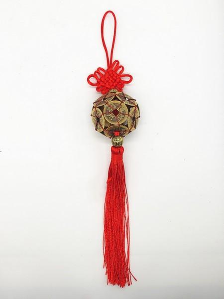 12 db. 24 mm-es kínai pénzérméből készült füzér, melyben az érmék nem a hagyományos módon, sorban vannak felfűzve, hanem gömb formában. Függeszthető felső végén misztikus csomó, alsó végén bojt.