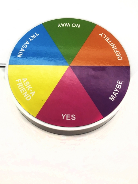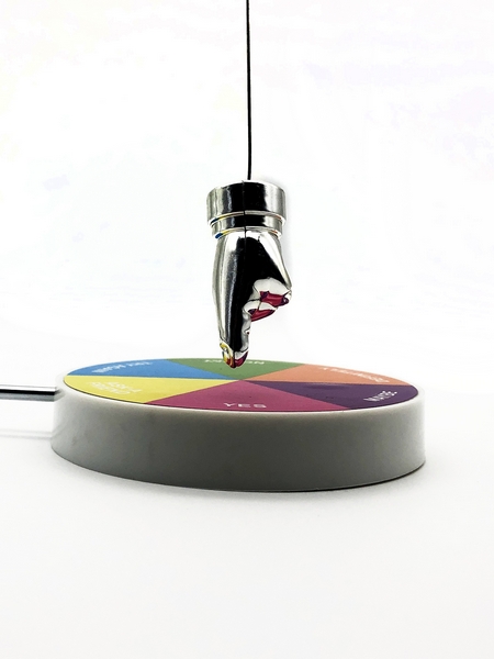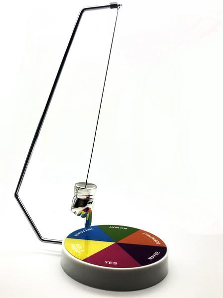 A tárcsában minden válasz alatt egy-egy kis mágnes van beépítve, az ingán függő mutató kéz ujjában is van egy mágnes. Ha az ingát ellendíted, az egy darabig inog, majd véletlenszerűen beáll az egyik válasz fölé. Finomabb technikával a tárcsa közepére állíthatod a mutató kezet, majd azt elengedve beáll az egyik válasz fölé.