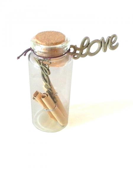 Ezt a kis palackot használhatod szerelmes tárgyú kívánság listád elkészítéséhez (a benne lévő kis tekercsekre írhatod vágyaidat)... De jópofa palackpostaként eljuttathatod benne szerelmednek szánt jókívánságaidat is! A mellékelt "Love" (szeretet, szerelem) szócska fémből készült, önmagáért beszél!