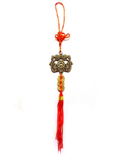 Ezen a függőn két sárkány fog közre egy kínai érmét, továbbá a medál alatt három kínai érme is található. A szimbólum jelentése: "áldott gazdagság".