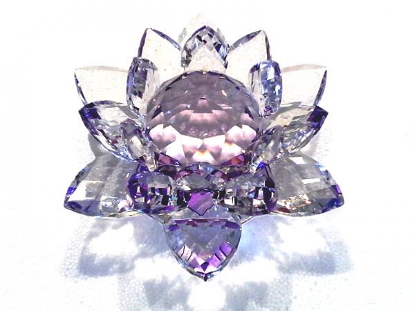 A lótusz szirmait képező színtelen kristályok, a kék színű ragasztás miatt tükrözik vissza a kék színt. Minden oldalról máshogy látjuk a színek játékát.