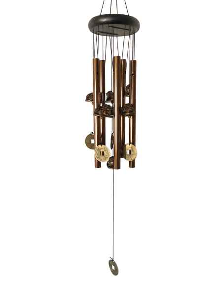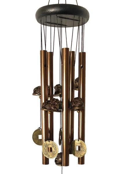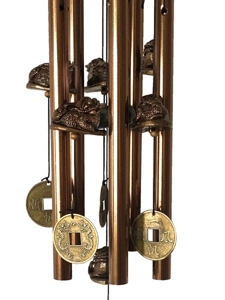 Leírása: a szélcsengő csövei körben vannak felfüggesztve a fa korongra. A csövek között középen fa korong függ az ütőszáron. Ez ütődik a szélcsengő csöveihez, így képződik annak hangja. A csövek között külön szárakon háromlábú béka figurák és kínai érmék függnek. Ezek is hozzáütődnek a csövekhez, ezzel is dúsítva a szélcsengő hangzását. Az ütőszárat is egy kínai érme tartja feszesen.