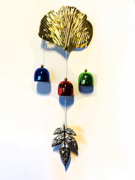 Leírása: a szélcsengő vázát képező arany színű legyezőn függ három száron három színes fém harangocska (kék, piros és zöld). Ezek ütődnek egymáshoz, így képződik a szélcsengő kellemes, fémes hangja. A középső csengő alatt egy leveles gally egészíti ki a kompozíciót.