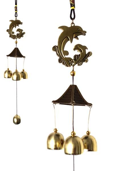 Leírása: a szélcsengő vázát képező pagoda tetőn függ három száron három réz harangocska. Középen, a csengők között függ az ütőszár az ütő golyóval. Ez ütődik a harangocskákhoz, így képződik a szélcsengő kellemes, fémes hangja. Az ütőszárat alul egy negyedik harangocska tartja feszesen, ám ez nem ütődik semmihez, így hangot sem ad (ezért ezt a szélcsengőt is a 3-as fém szélcsengők közé soroljuk. A pagoda tető fölött delfinpár díszítés látható.