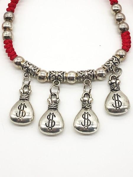 Különleges fonással készült fonál karkötő négy fém kincseszsák medállal | |